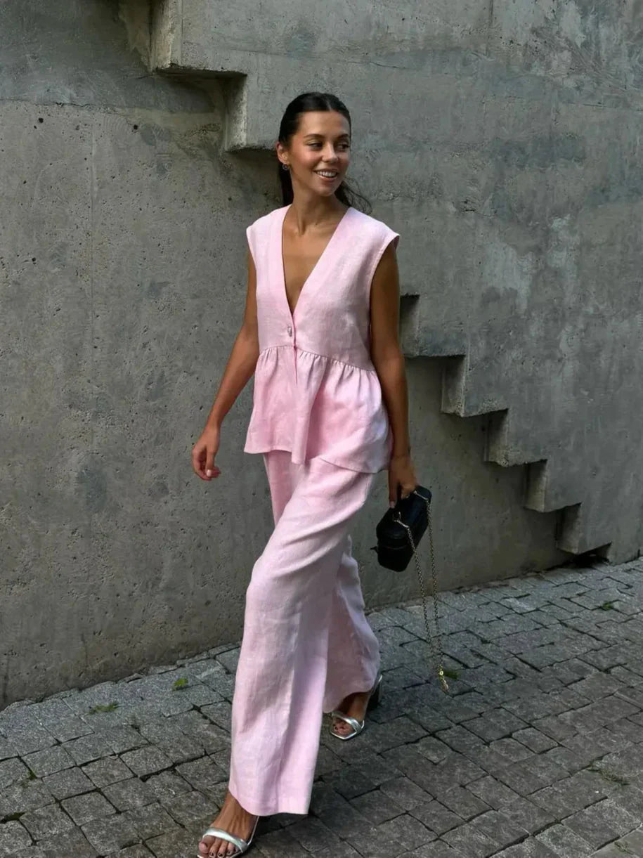 Scopri il tuo nuovo completo estivo preferito: un elegante set a due pezzi che unisce con semplicità comfort e raffinatezza.